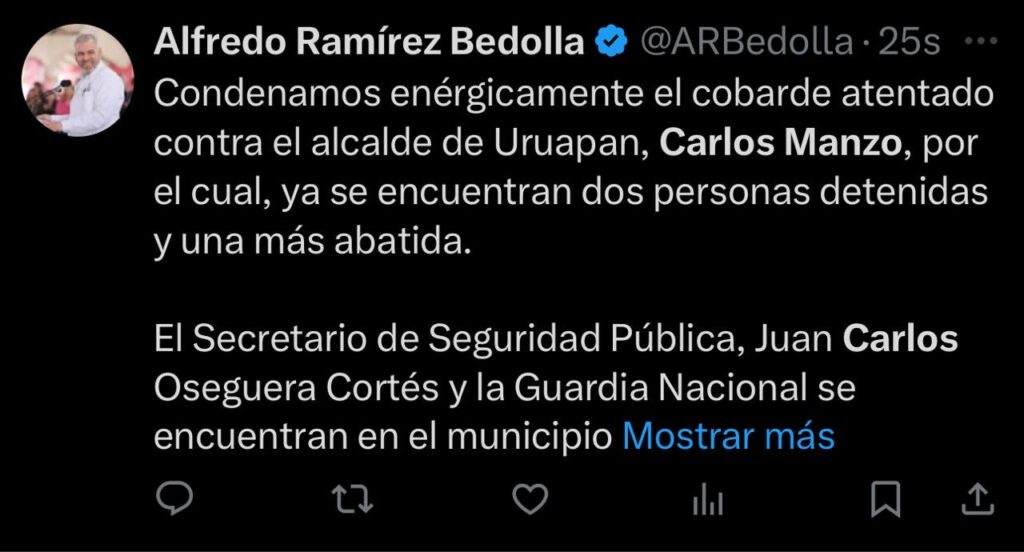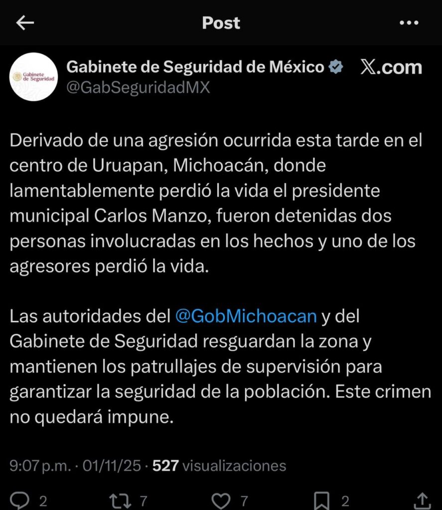 Uruapan, Mich., a 1 de noviembre de 2025. – El presidente municipal de Uruapan, Carlos Manzo, perdió la vida a consecuencia de una agresión armada ocurrida esta tarde en el centro de la ciudad, informaron autoridades estatales.