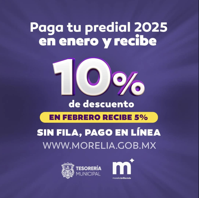 Morelia, Mich., a 9 de enero de 2025.– Con el fin de apoyar el pago puntual de los ciudadanos, el Gobierno de Morelia informa que sigue vigente y aún se puede aprovechar el 10 por ciento de descuento en la contribución municipal del Predial 2025, el cual se ofrece en casi una veintena de módulos disponibles tanto en la zona urbana como la rural.