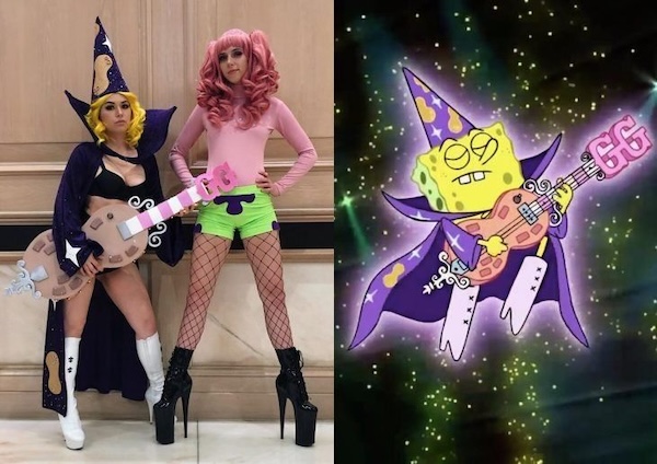 Este es para las que aman un disfraz único. SpongeBob en versión mago rockstar y su sidekick: looks extra, pelucas y botas imposibles de caminar. Nadie lo va a repetir en la fiesta.