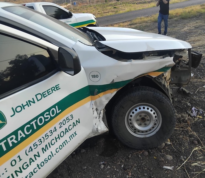 Apatzingán Mich., a 6 de Febrero del 2026.- La mañana de este viernes alrededor de las 07:00 horas, se registró un accidente vehicular sobre la carretera Apatzingán–Buenavista Tomatlán, a la altura de la desviación al Ejido El Recreo, donde se vieron involucradas una camioneta Honda HR-V, color negro, y una camioneta de trabajo perteneciente a la empresa Tractosol, concesionario autorizado de maquinaria agrícola John Deere.