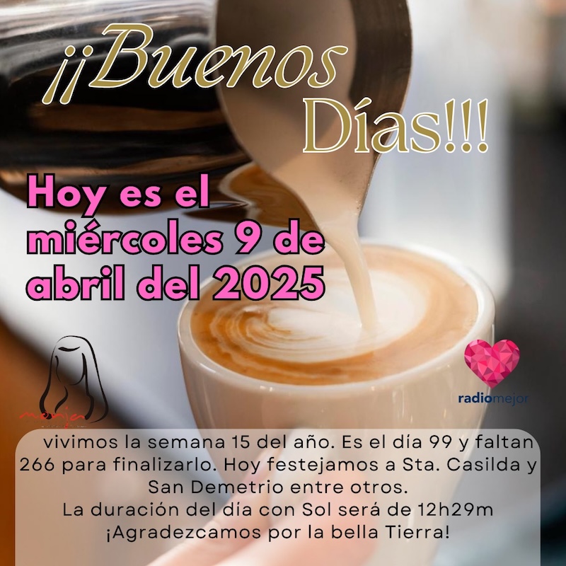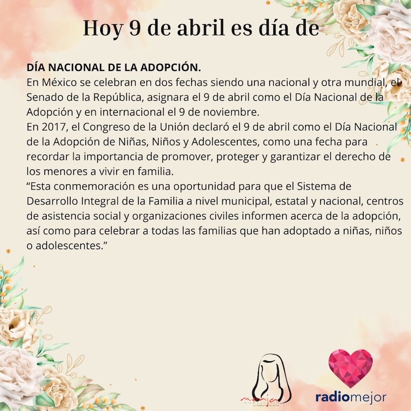 9 de abril de 2025 Radio Mejor Lifestyle 0 Mitad de semana, amigosssss 🫶🏻🥹❤️🩹 Hoy celebramos el día nacional de la adopción. 🤱 Tags: EfemeridesInteresante