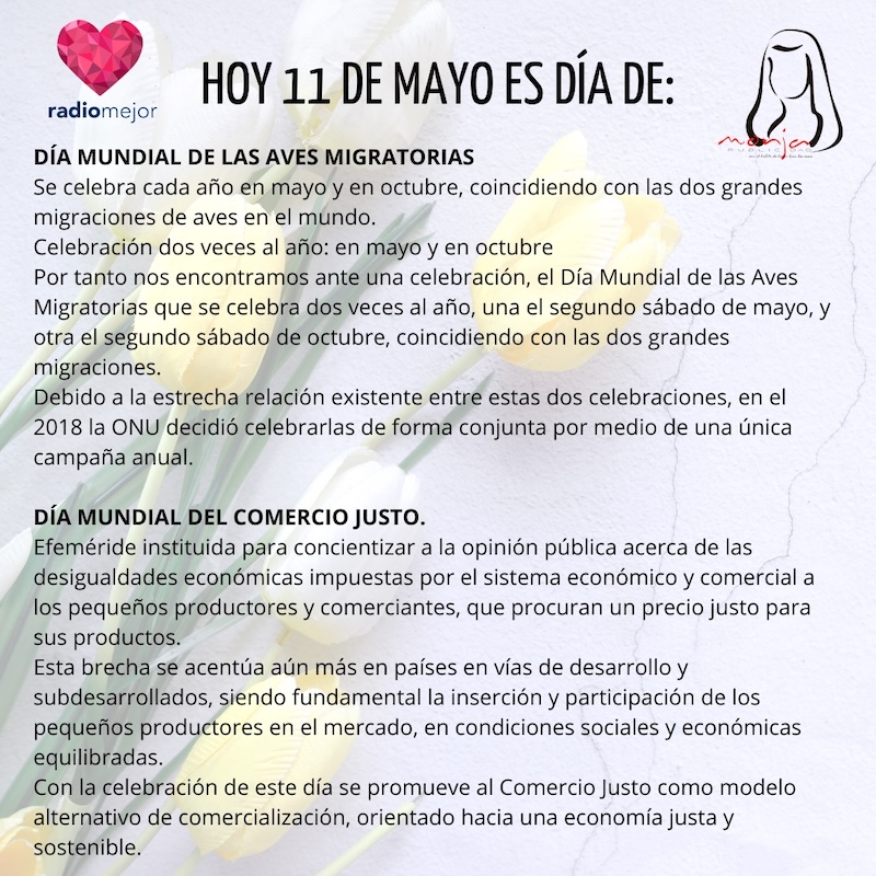 11 de mayo de 2025 Radio Mejor Lifestyle 0 Muy buenos días, excelente domingo ✨🌅🧡 Hoy es el día mundial de las aves migratorias y el día mundial del comercio justo. Tags: EfemeridesInteresante