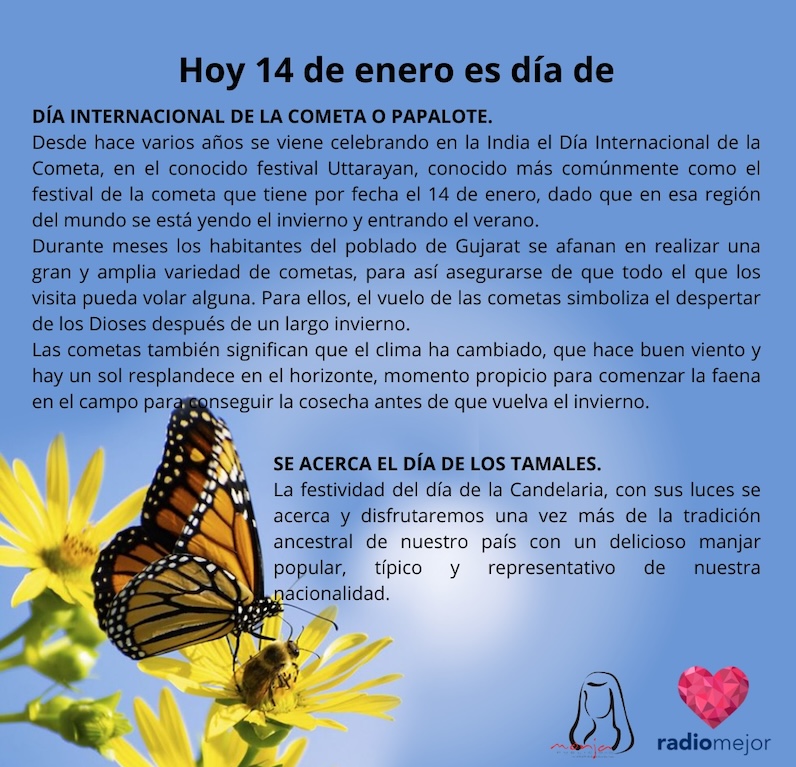 14 de enero de 2025 Radio Mejor Lifestyle 0 Buen día, bonito martes 🙂🪁 Hoy se celebra el día mundial de la lógica, el día mundial de vestir a tu mascota y el día internacional de la cometa o el papalote. 🪁🪁🪁 Tags: EfemeridesInteresante