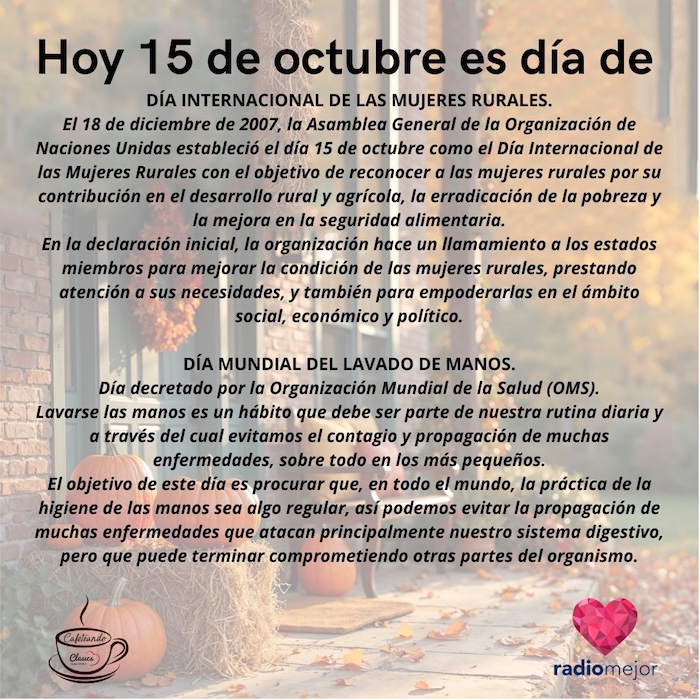 15 de octubre de 2025 Radio Mejor Lifestyle 0 El miércoles es perfecto para agradecer lo que ya lograste (づ ᴗ _ᴗ)づ♡ Hoy es el día internacional de las mujeres rurales y el día mundial del lavado de manos. 🫧👏 Tags: EfemeridesInteresante