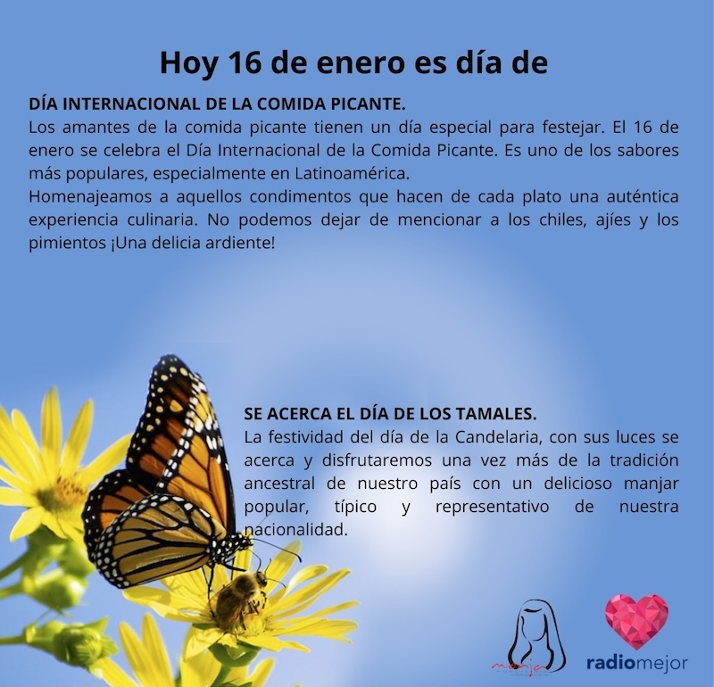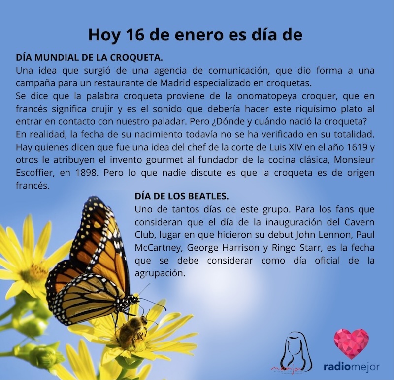 16 de enero de 2025 Radio Mejor Lifestyle 0 ¡Buenos días! 🌞 Hoy celebramos el día mundial de la croqueta, el día de los Beatles y el día internacional de la comida picante. 🎼🌶️ Tags: EfemeridesInteresante