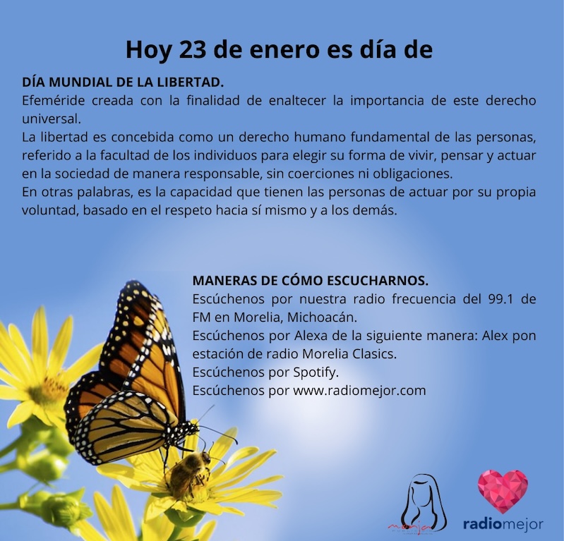 23 de enero de 2025 Radio Mejor Lifestyle 0 ¡Buenos días, estamos a NADA del VIERNEEES! 🗣️🗣️ Hoy celebramos el día mundial de la libertad. ⛓️💥 Tags: EfemeridesInteresante