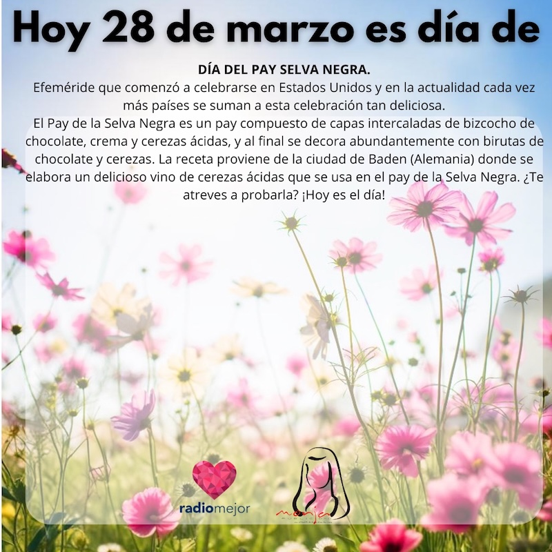 28 de marzo de 2025 Radio Mejor Lifestyle 0 ¡JUEVES! Y hoy celebramos algo muy rico: al pay selva negra 🥧✨ Hoy se celebra el día del pay selva negra 🥧✨ Tags: EfemeridesInteresante