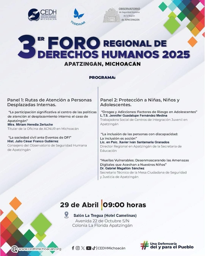 El Tercer Foro Regional de Derechos Humanos tendrá lugar en el salón La tregua, del hotel Camelinas, ubicado en la avenida 22 de octubre, colonia La Florida, de la ciudad de Apatzingán, el martes 29 de abril, a partir de las 9 de la mañana.