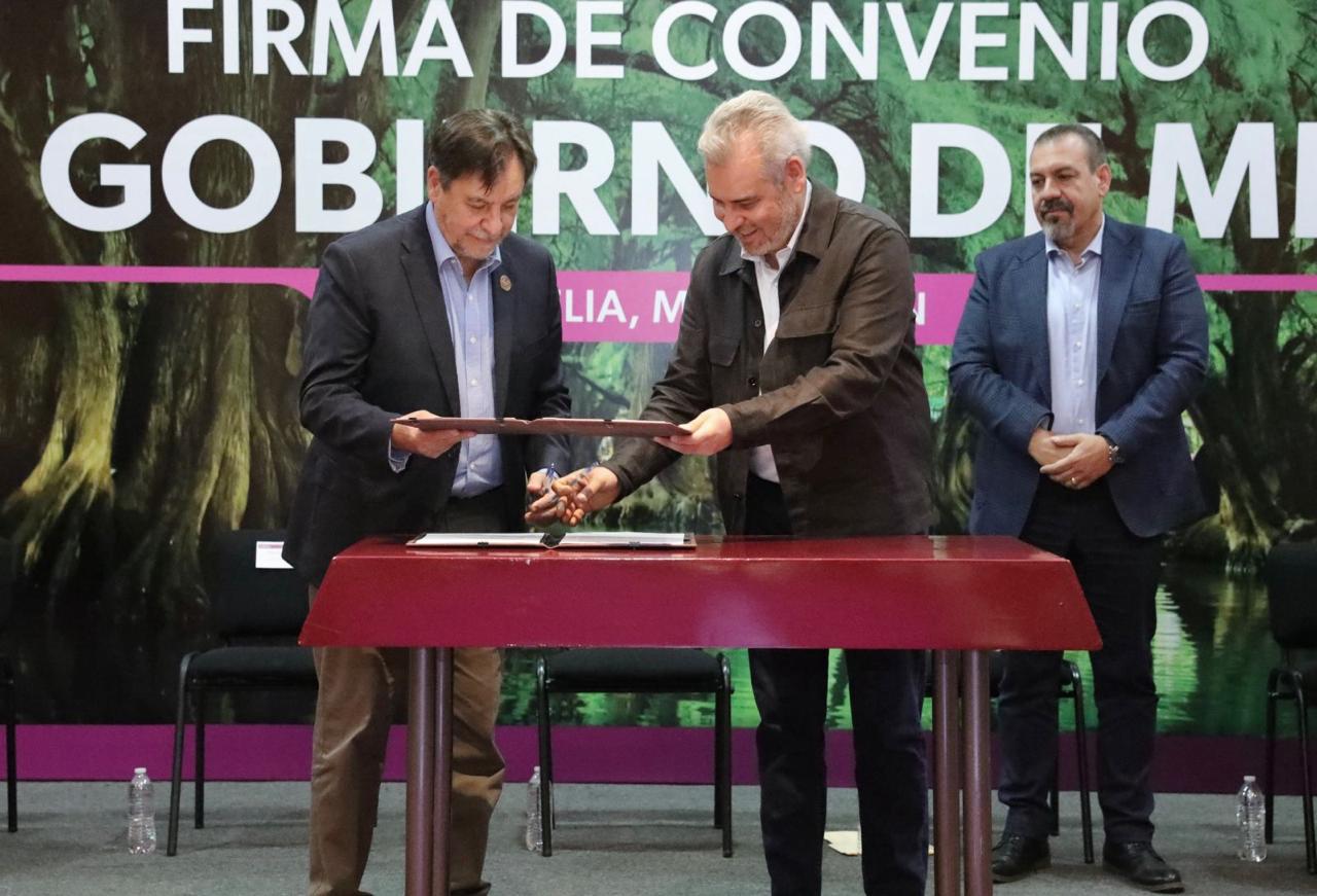 Morelia, Mich., a 30 de mayo de 2025.- El gobernador Alfredo Ramírez Bedolla anunció que su administración va por declarar más de 500 mil hectáreas de Áreas Naturales Protegidas (ANP) estatales y federales, como parte del convenio firmado con el titular de la Comisión Nacional de Áreas Naturales Protegidas (Conanp), Pedro Álvarez Icaza.
