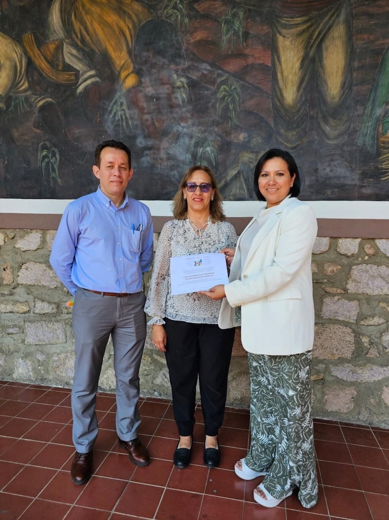 La regente Janeth Morales acompañada del secretario Académico, José Luis Pineda, recibió un reconocimiento por la participación del Colegio Primitivo y Nacional de San Nicolás de Hidalgo en dicha evaluación, de manos de Sandra Susana Tapia Gómez, integrante de PISA en México.