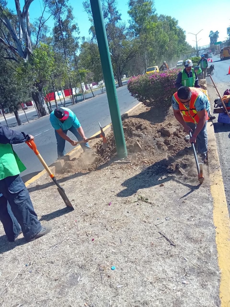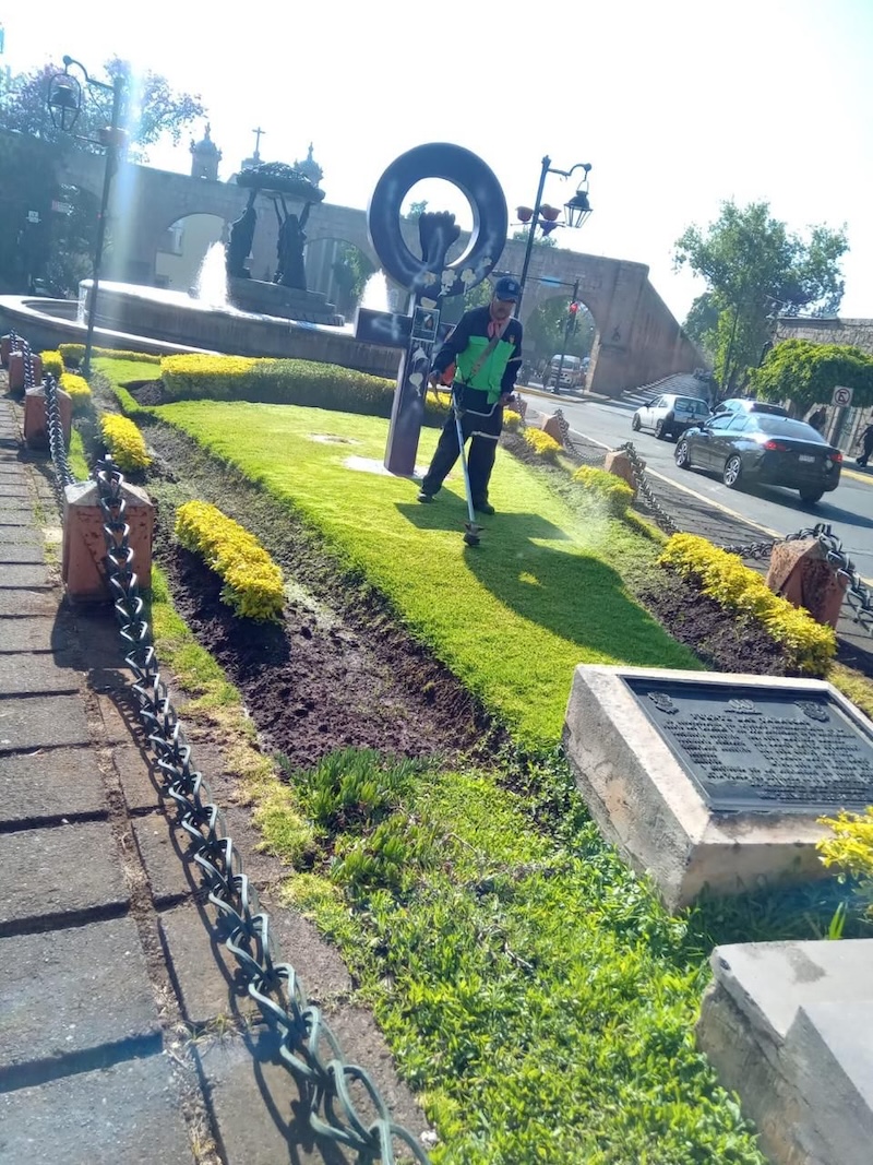 Brigadas de la Dirección de Parques y Jardines de la referida Secretaría, efectuaron labores para evitar la erosión de los camellones centrales de la avenida Madero Oriente, a la altura de la icónica fuente y monumento representativo de Morelia, así como de la plaza Villalongín.