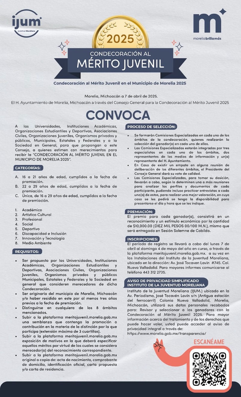 El Gobierno Municipal reitera su invitación a las y los jóvenes a registrarse en dicha convocatoria, en la convicción de que con la participación de las morelianas y morelianos desde edad temprana, Morelia Brilla Más.