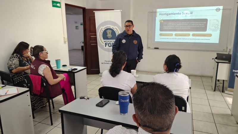 Morelia, Mich., a 20 de abril de 2026.- En línea con la visión del Fiscal General, Carlos Torres Piña, de fortalecer el bienestar integral del personal, la Fiscalía General del Estado de Michoacán (FGE), a través del Instituto de Capacitación y Servicio Profesional de Carrera, impartió la capacitación “Prevención, Atención, Actuación y Sanción en casos de Hostigamiento y Acoso Laboral y/o Sexual”, con el objetivo de consolidar entornos laborales seguros, respetuosos y libres de violencia.