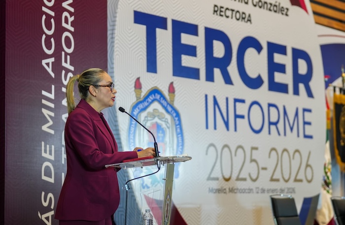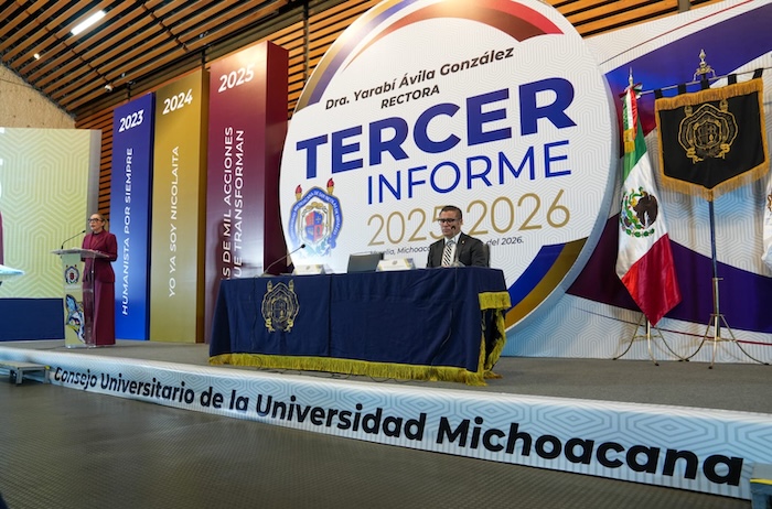 Morelia, Mich., a 12 de enero de 2026.- “La Universidad Michoacana de San Nicolás de Hidalgo (UMSNH) que recibimos estaba de pie, pero tambaleante. La Universidad que hoy presentamos está firme, con rumbo y futuro sustentable”, afirmó la rectora Yarabí Ávila González, al presentar su Tercer Informe de Actividades ante el Consejo Universitario.