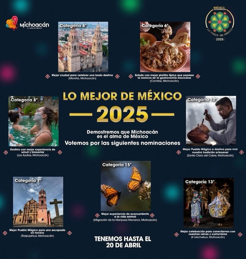 Votar es muy sencillo, solo debes ingresar a https://lomejormexico.com/, donde se pedirá que generes un usuario con tu nombre y correo electrónico, para después comenzar la dinámica en la que podrás apoyar a los siete atractivos michoacanos nominados. No es necesario que llenes las 14 categorías, la plataforma permite elegir directamente los destinos de tu interés para que participes, concluyó la dependencia estatal.