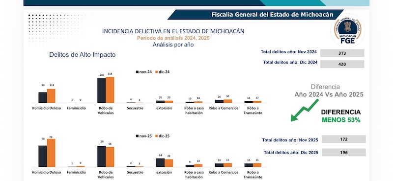 En el comparativo de los meses de noviembre y diciembre, el Fiscal General informó que en noviembre de 2024 se registraron 373 delitos de alto impacto y en diciembre de ese mismo año 420. En contraste, en noviembre de 2025 se contabilizaron 172 eventos y en diciembre 196, lo que representa una disminución del 53 por ciento en ambos periodos.