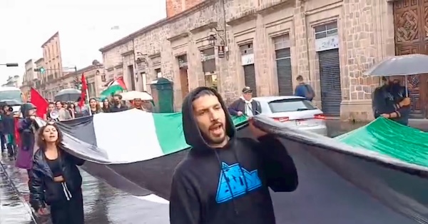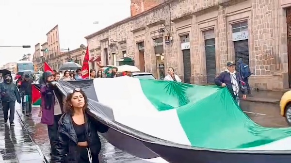 Morelia, Mich., a 18 de agosto del 2025.- Con mantas, banderas y mensajes de paz, decenas de personas se reunieron en la Plaza Ocampo para exigir el fin de la ofensiva en Palestina y denunciar la crisis humanitaria que enfrenta la población de Gaza.