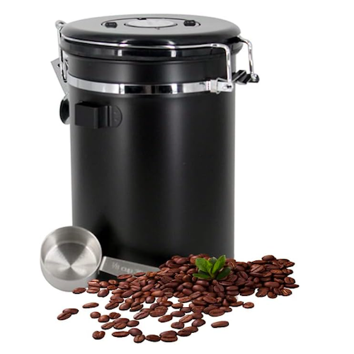 Tener la bolsa de café molido o en grano ahí no más no se ve cute, además el café no se conserva bien. Mejor regálale un bote hermético de acero inoxidable para que le dure mucho más tiempo.