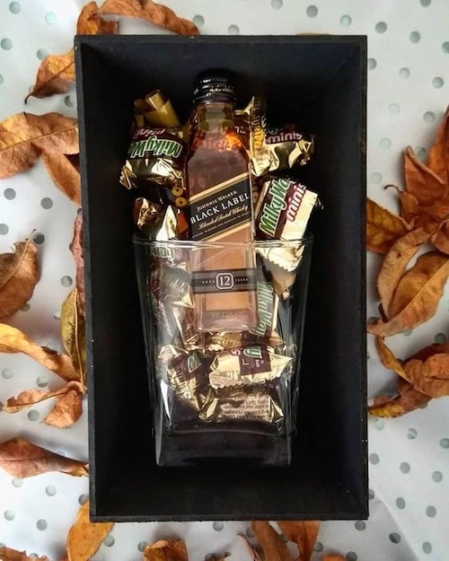 Una botellita de alcohol nunca se desprecia, puedes acompañarla con chocolates para que se vea linda.