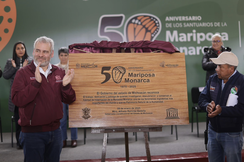 Durante el evento realizado en el Santuario Sierra Chincua, el mandatario develó una placa conmemorativa al cumplirse medio siglo de que fueron descubiertos los sitios donde hiberna la mariposa, y señaló que la imagen del 50 aniversario se utilizará de manera oficial durante todo el año.