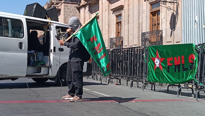 Morelia, Mich., a 5 de noviembre del 2025.- En el que es el cuarto día consecutivo de manifestaciones en la capital del estado, al parecer los ánimos de protesta comienzan a disminuir, pues de tres convocatorias hechas para movilizarse este miércoles en Morelia, únicamente el Frente Nacional de Lucha por el Socialismo (FNLS) salió a las calles del centro histórico.