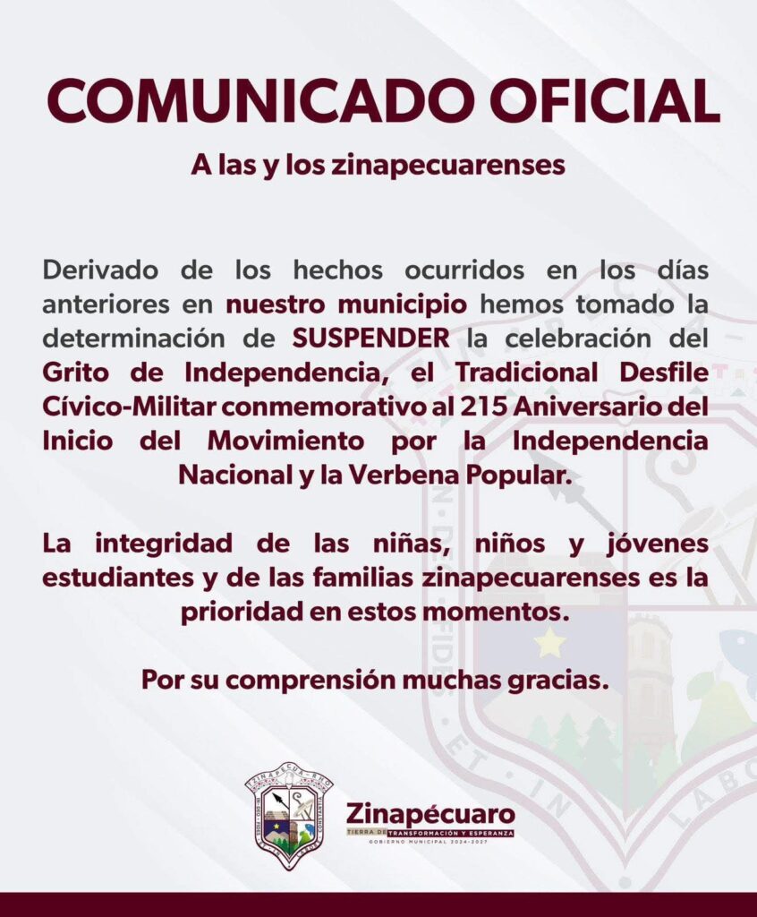 “Derivados e mls hechos ocurridos en días anteriores en nuestro municipio hemos tomado la determinación de suspender la celebración del grito de independencia. La integridad de las niños y niños esfuiantes y de las familias es la prioridad en estos momentos”, señala el comunicado.
